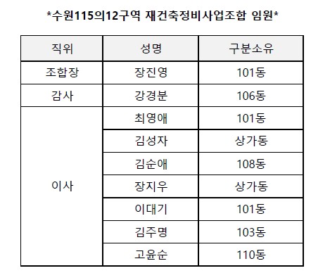 Copyright¨Ï 2016 ¼ö¿ø115-12±¸¿ª ÁÖÅÃÀç°ÇÃàÁ¤ºñ»ç¾÷Á¶ÇÕ. All rights reserved.